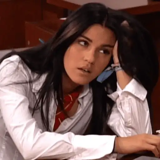 Mulher com expressão de surpresa ou preocupação, vestida com uma camisa branca e uma gravata vermelha, com a mão no…