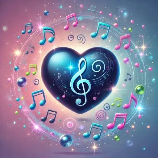 Um coração azul brilhante com uma clave de sol no centro, cercado de notas musicais coloridas e estrelas.