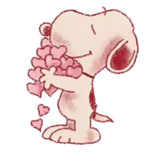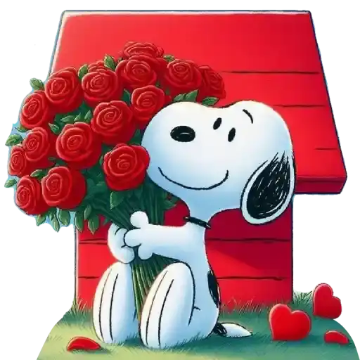 Snoopy de chapéu vermelho segurando um cartão de Valentine's Day, cercado de corações e caixas de presentes.