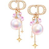 Um par de brincos de ouro com pérolas grandes e pequenas pedras preciosas rosa e transparentes. As letras 'CD' estão no…