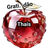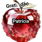 Uma maçã vermelha brilhante com gotículas de água, com o texto 'Grati. dão' na parte superior e 'Patrícia' no centro.