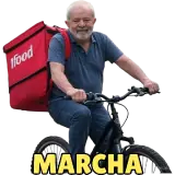 Mickey Mouse de óculos de sol, mochila e roupa verde, andando de bicicleta com o texto 'Bom Dia' ao lado.