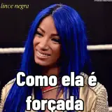 Uma mulher com cabelo azul e um sorriso, com o texto "Como ela é forçada" sobreposto.