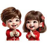 Dois personagens infantis, um menino e uma menina, vestidos com trajes vermelhos tradicionais chineses, estão lado a…