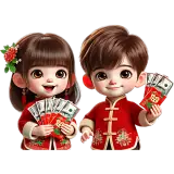 Um menino e uma menina vestidos com roupas tradicionais chinesas vermelhas, segurando dinheiro em envelopes vermelhos.