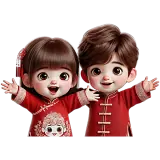 Dois crianças, um menino e uma menina, vestidos com roupas vermelhas tradicionais chinesas, com as mãos estendidas e…