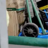 Uma jovem mulher asiática com cabelos pretos e um casaco rosa empurra um carrinho de compras cheio de produtos em um…