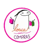 Uma figurinha de uma pessoa feliz com compras, com o texto 'louca por COMPRAS'.