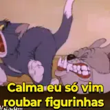 Tom e Jerry em uma cena engraçada, com o texto 'Calma eu só vim roubar figurinhas' sobreposto.