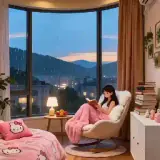 Hello Kitty com um laço vermelho no cabelo, segurando um coração vermelho, rodeada de corações coloridos e com a frase…
