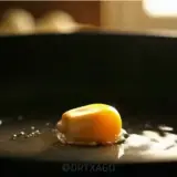 Um ovo mexido em uma frigideira preta, com gota de óleo ao redor, em ambiente escuro.