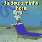 Um personagem de desenho animado, polvo com expressão facial contrariada, sentado em uma cadeira de praia azul. O texto…