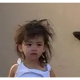 Uma menina de olhos azuis e cabelos loiros, vestindo uma blusa branca com suspensorios azuis, com uma expressão…