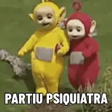 Dois personagens de Teletubbies, um de amarelo e outro de vermelho, com texto 'PARTIU PSIQUIATRA' em branco na parte…