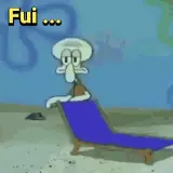 Um desenho do personagem Lula, do desenho 'Bikini Bottom', sentado em uma cadeira de praia azul, com a expressão facial…