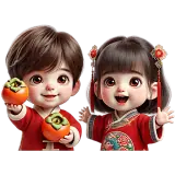 Dois crianças vestidas com roupas tradicionais chinesas segurando laranjas, com um fundo branco. A menina tem cabelos…