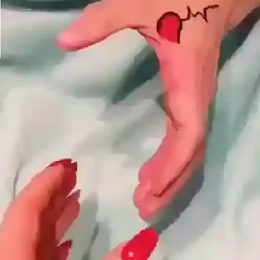 Mano con un corazón dibujado con línea de electrocardiograma y uñas pintadas de rojo, tocando otra mano con uñas rojas.