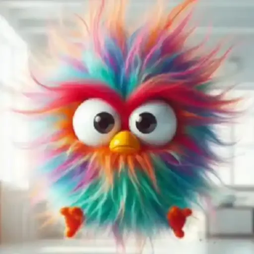 Un pájaro colorido y lindo con plumas rosadas, azules, naranjas y moradas, ojos grandes y redondos y un pico naranja. Parece tener una mirada sorprendida o asustada.