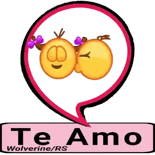Dos melocotones amarillos con expresiones felices y un lazo rosa y otro morado, dentro de una burbuja de diálogo con la frase 'Te Amo'.