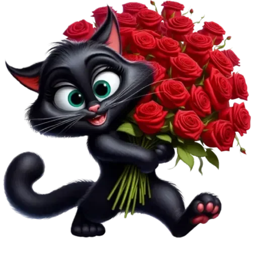 Gato negro adorable con ojos verdes y orejas rosadas, cargando un ramo de rosas rojas.
