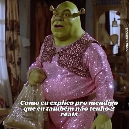 Shrek vestido de rosa con glitter, cargando una bolsa, con texto 'Como eu explico pro mendigo que eu também não tenho 2 reais'.
