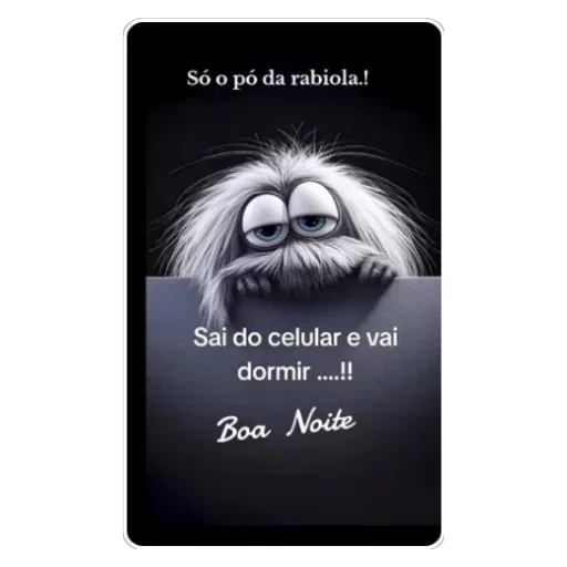 Un monstruo fofo con pelo blanco y ojos grandes, con texto blanco que dice 'Só o pó da rabiola!', 'Sai do celular e vai dormir...!!!' y 'Boa Noite'.