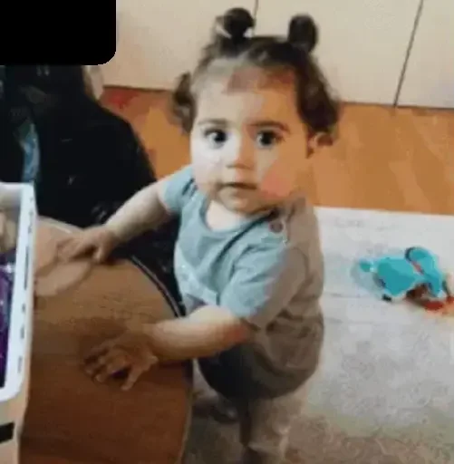 Un bebé con dos moños altos en el cabello, vestido con una camiseta azul, está de pie con las manos en un objeto redondo.