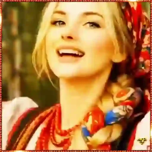 Mujer rubia con expresión feliz, usando un pañuelo rojo en la cabeza y un collar de cuentas rojas.