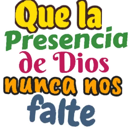 Una figurita con texto colorido que dice 'Que la Presencia de Dios nunca nos falte'. Las palabras están en diferentes colores: amarillo, verde, rosa, naranja y azul.
