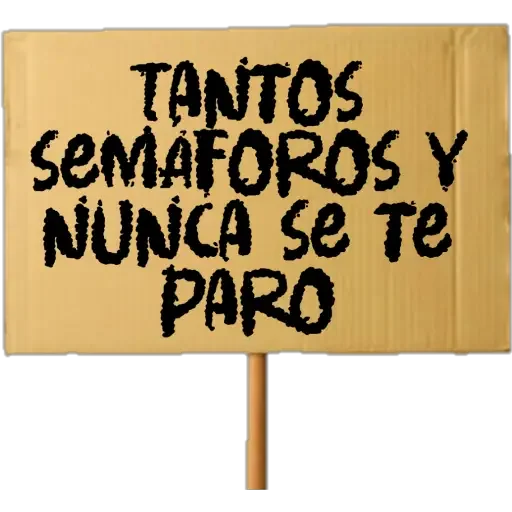 Señal de cartón con el texto 'TANTOS SEMÁFOROS Y NUNCA SE TE PARO' escrito en negro. La señal parece ser improvisada y tiene un palo de madera.