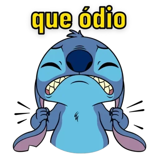 Stitch, personagem de Lilo & Stitch, com expressão triste e orelhas rosa, texto 'NAO BRIGA COMIGO' em preto com…