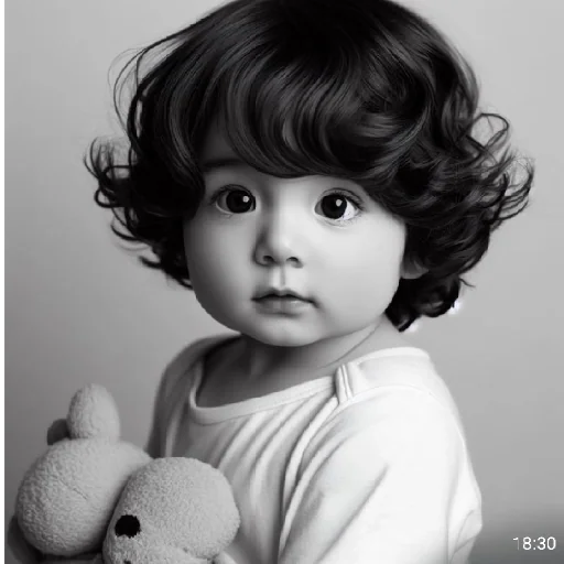 Un niño con cabello castaño rizado y un osito de peluche en blanco y negro.