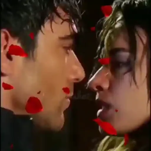 Una pareja besándose, con pétalas de rosa alrededor. El hombre tiene cabello negro y está usando una camisa negra, mientras la mujer tiene cabello castaño.