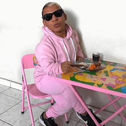 Hombre de mediana edad, calvo, usando gafas de sol, sentado en una silla rosa, vestido con un conjunto de sudadera rosa, en una mesa colorida con un vaso y un plato.