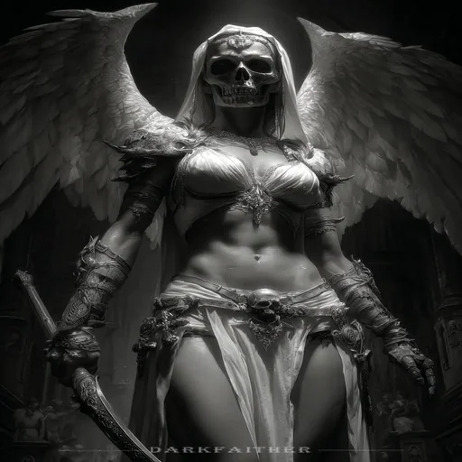 Una figura femenina con alas de ángel y una calavera, vestida con un atuendo que parece ser una mezcla de armadura y tela, con un aura de luz alrededor de la cabeza.