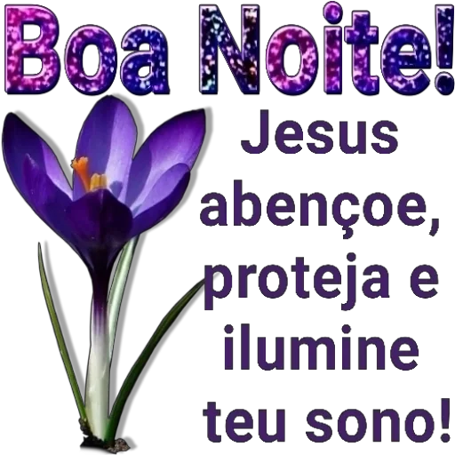 Una flor morada con hojas verdes y la frase 'Boa Noite!' en letras moradas brillantes. Debajo, el texto 'Jesus abençoe, proteja e ilumine teu sono!'