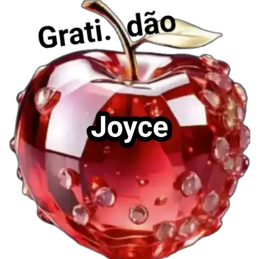 Una manzana roja brillante con gotas de agua, con el texto 'Grati. dão Joyce' superpuesto.