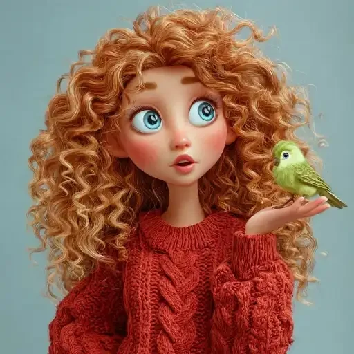 Una niña con cabello rizado rojizo y ojos azules claros mira a un pájaro verde que está en su mano. Ella viste un suéter rojo.