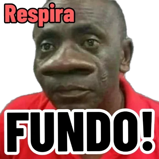 Un hombre negro con expresión facial seria y una nariz grande, usando una camisa roja. El texto 'Respira' está escrito en la parte superior izquierda y 'FUNDO!' en la parte inferior.