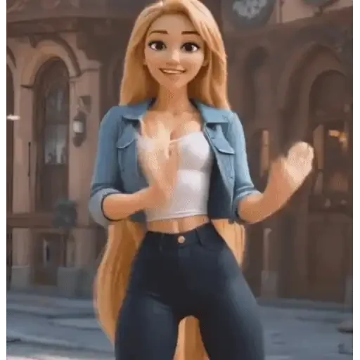 Una mujer rubia con una sonrisa, vestida con una camisa de jeans y una blusa blanca, haciendo un gesto con las manos.