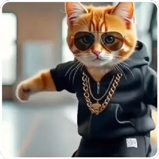 Gato naranja con gafas de sol y cadenas de oro vistiendo una sudadera negra.
