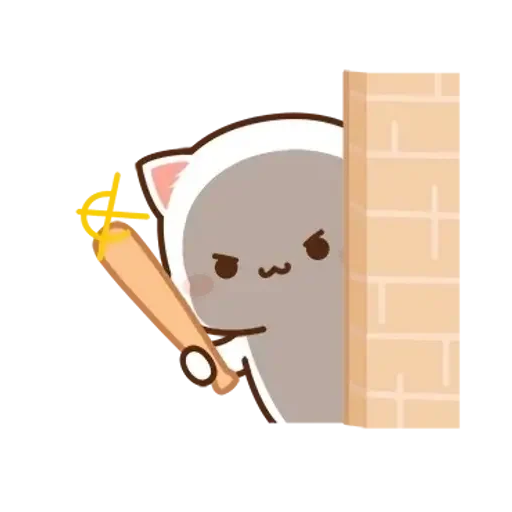 Un gato gris con expresión seria asomando detrás de una pared y sosteniendo un rollo de cinta adhesiva dorada.