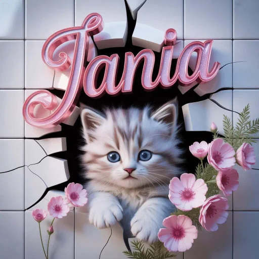 Un gatito gris y blanco con ojos azules asoma a través de una pared agrietada, rodeado de flores rosadas. El nombre 'Tania' está escrito en letras rosadas sobre el gatito.
