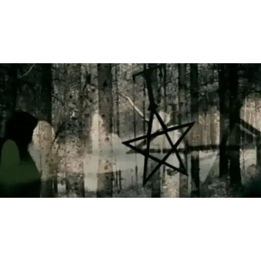 Una imagen oscura de un bosque con una estrella de cinco puntas negra en el centro, con tonos de gris y negro.