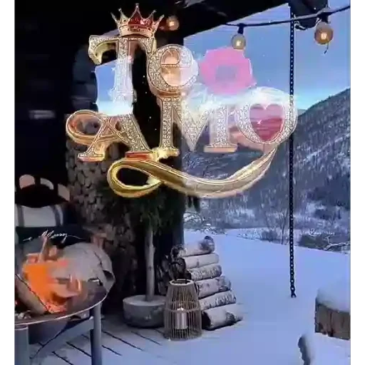 Una escena de invierno con una chimenea encendida, nieve en el suelo y una montaña al fondo. En el centro, una decoración con letras doradas y rosa formando la palabra 'Love'.