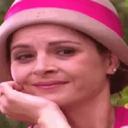 Mujer joven con un sombrero rosa y blanco, apoyando su mentón en la mano, con una ligera sonrisa.