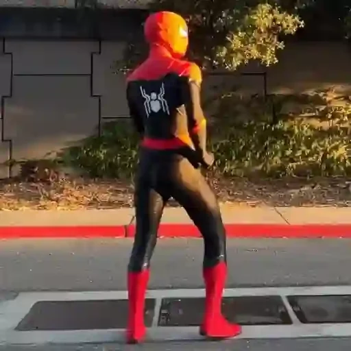 Homem-Aranha correndo em um rodeio, usando um traje de borracha do super-herói.