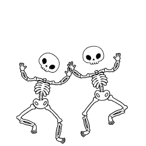 Dos esqueletos bailando con los brazos levantados y las piernas flexionadas, con ojos negros.