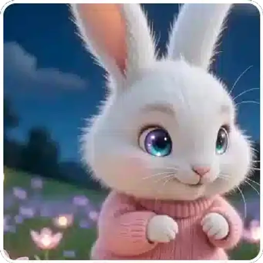Un conejo blanco adorable con ojos azules brillantes y orejas grandes, con un suéter rosa, en un campo con flores.