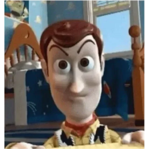 Woody de Toy Story con expresión sorprendida y ojos muy abiertos, en un dormitorio infantil.